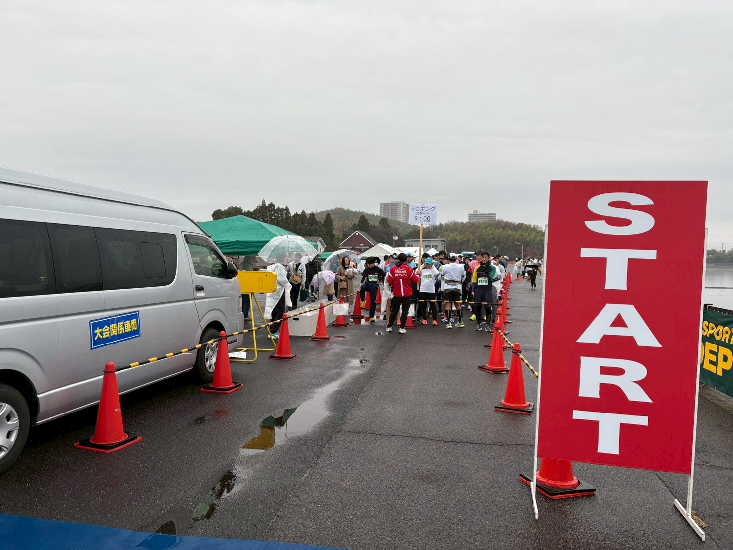 雨だとトイレ行きたくなりますよね…そしてなるべく濡れたくないとテントの中にこもります。この中からスタートブロックを間違えないか、迷子はいないか等を考えながらアナウンスしていました。ま、自己責任なんですけどね笑